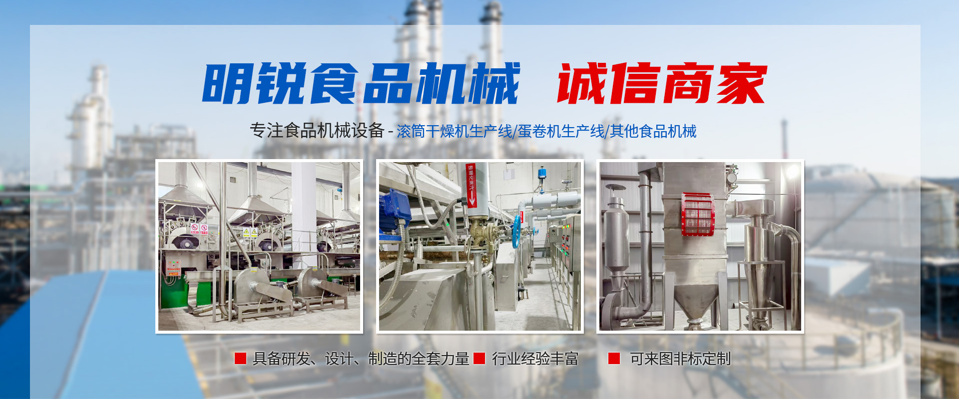 東臺市明銳食品機械有限公司是一個從事食品機械設備設計、制造和安裝調(diào)試的專業(yè)廠家,在食品生產(chǎn)工藝、生產(chǎn)流程及設備設計和制造有著多年豐富經(jīng)驗。主要產(chǎn)品有蛋卷機生產(chǎn)系列,滾筒干燥機生產(chǎn)線系列以及其他食品機械。目前各種生產(chǎn)線規(guī)格齊全,國內(nèi)技術(shù)優(yōu)良,產(chǎn)品遠銷亞洲各國及國內(nèi)二十多個省市自治區(qū)。